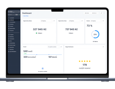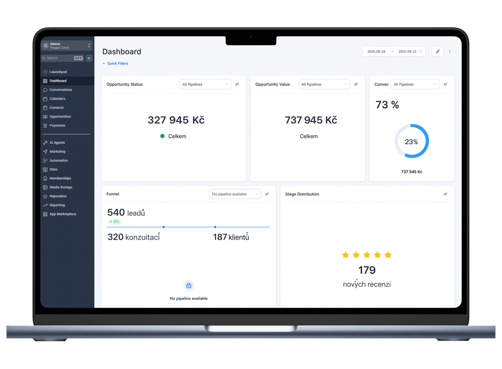 Přehledná platforma propojuje všechny nástroje – chatboty, kampaně, recenze i databázi klientů. V reálném čase vidíte, kolik klientů přibylo, kolik peněz bylo vygenerováno a jak roste vaše reputace. Jedno místo, absolutní přehled.